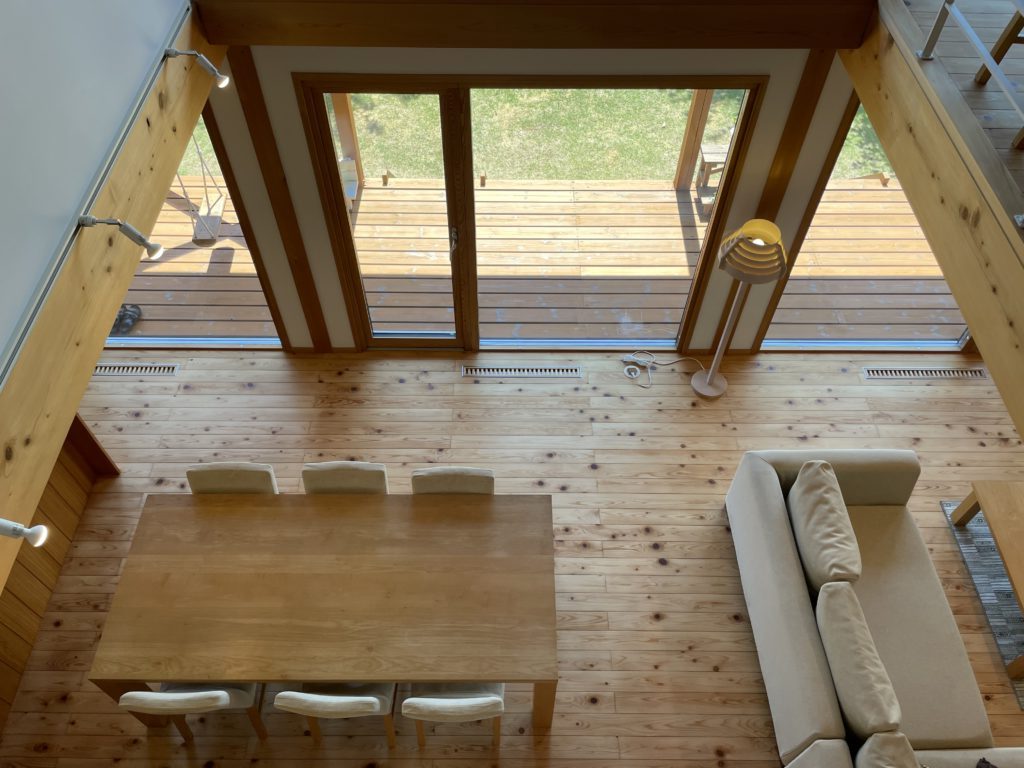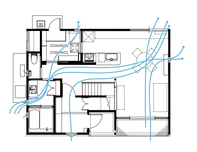 自然の風を室内に効率良く取り込むには、窓の配置が大きく影響します。その土地の風向きに合わせて、風上に風の入口となる窓を、風下には出口となる窓を設けることによって風を効率良く取り込めるように開口部の設計をしています。