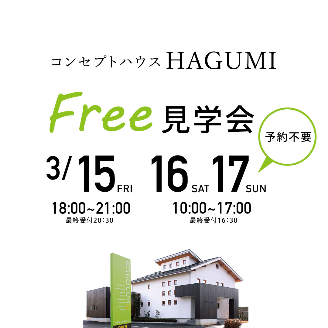 3/15.16.17 コンセプトハウスHAGUMI Free見学会 夜カフェ/整理収納セミナーも同時開催!