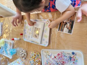 真っ白のフォトフレームを、シールやタイルなどのパーツで自由にデコレーションし、