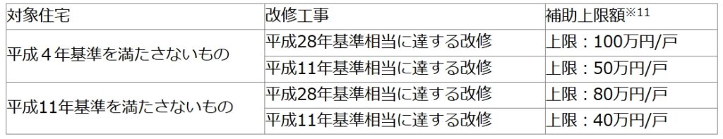 補助要件:開口部、躯体等の断熱改修、エコ住宅設備の設置等により、平成28年または平成11年基準相当に達する改修