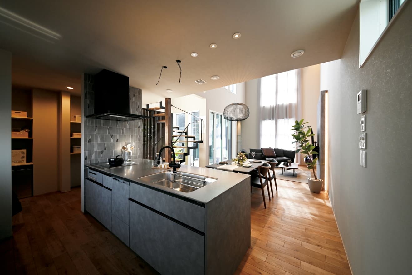 ママの家事動線を念頭にしながらも、回遊性のあるファミリールームとそこにつながっている和室、階段周りの小さな図書館、広々とした2階スタディコーナー、そしてゆったりしたウッドデッキなど、子どもが住まいの中に居てもしっかり足を使って動き回れるようなプランに。