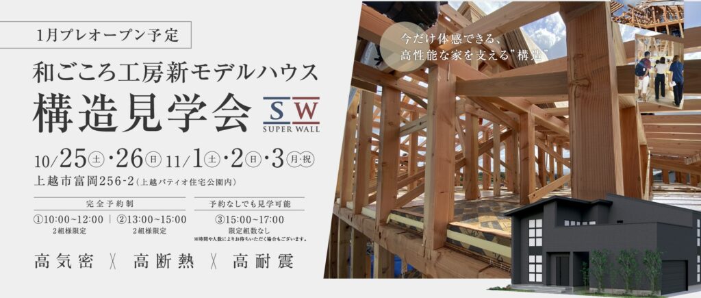 10/25.26.11/1.2.3開催!和ごころ工房新モデルハウス構造見学会 1月プレオープン予定の和ごころ工房新モデルハウスで構造見学会を開催します! 今回から新たに導入したスーパーウォール工法で建築しています。 建築中の”真の姿”が見れる、今しか見れない期間限定の見学会です! 今回は予約なしでもご見学いただける時間帯もありますので、お買い物のついでにふらっと気軽にお立ち寄りください! 【開催日時】 10月25日(土)、26日(日) 11月1日(土)、2日(日)、3日(月・祝) 各日3部制 ①10:00~12:00 限定2組 完全予約制 ②13:00~15:00 限定2組 完全予約制 ③15:00~17:00 入場制限なし・予約不要 ※ただし、時間帯によりお待ちいただく場合がございます。 【開催場所】 上越市富岡256-2 上越パティオ住宅公園内和ごころ工房新モデルハウス 【予約方法】 専用の予約フォームもしくはお電話(025-527-5560)からご予約をお願いいたします。 全日とも15:00~17:00の時間帯については予約がなくても見学いただけます。 【お問い合わせ先】 TEⅬ:025-527-5560 ご不明点等がございましたらお気軽にお電話ください。 \今回の構造見学会こんな方におすすめ/ ・上越妙高地域で注文住宅をご検討の方 ・家の構造を見てみたい方 ・家族が安心安全で快適に過ごせるお家を建てたい方 ・住宅会社選びで悩んでいる方 など