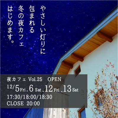 “夜は家族がいちばん集う時間” WaGOCOROオリジナルブレンド珈琲と パティスリーオラランティ様のスイーツを楽しみながら、 ご家族だけでゆっくりとお過ごし頂けます。 照明の使い方など、普段は見られない心地良い夜のHAGUMIをご体感下さい。 皆様のお越しをお待ちしております。 【過去の夜カフェの様子はこちら】 ▲パティスリーオラランティ様のケーキとスタッフおすすめコーヒー ▲日中とは異なる表情を見せるコンセプトハウスHAGUMI 【ご予約制】1日1組限定 OPEN 12/5(金)・6(土)・12(金)・13(土) 受付時間 17:30/18:00/18:30(20:00閉館) ご都合の良いお時間でご予約下さい。 ご予約はお電話または下記HP予約フォームよりお申込み頂けます。 【夜カフェ専用予約フォームはこちら】 TEL 025-527-5560 ご不明な点がございましたら、お気軽にお問い合わせ下さい